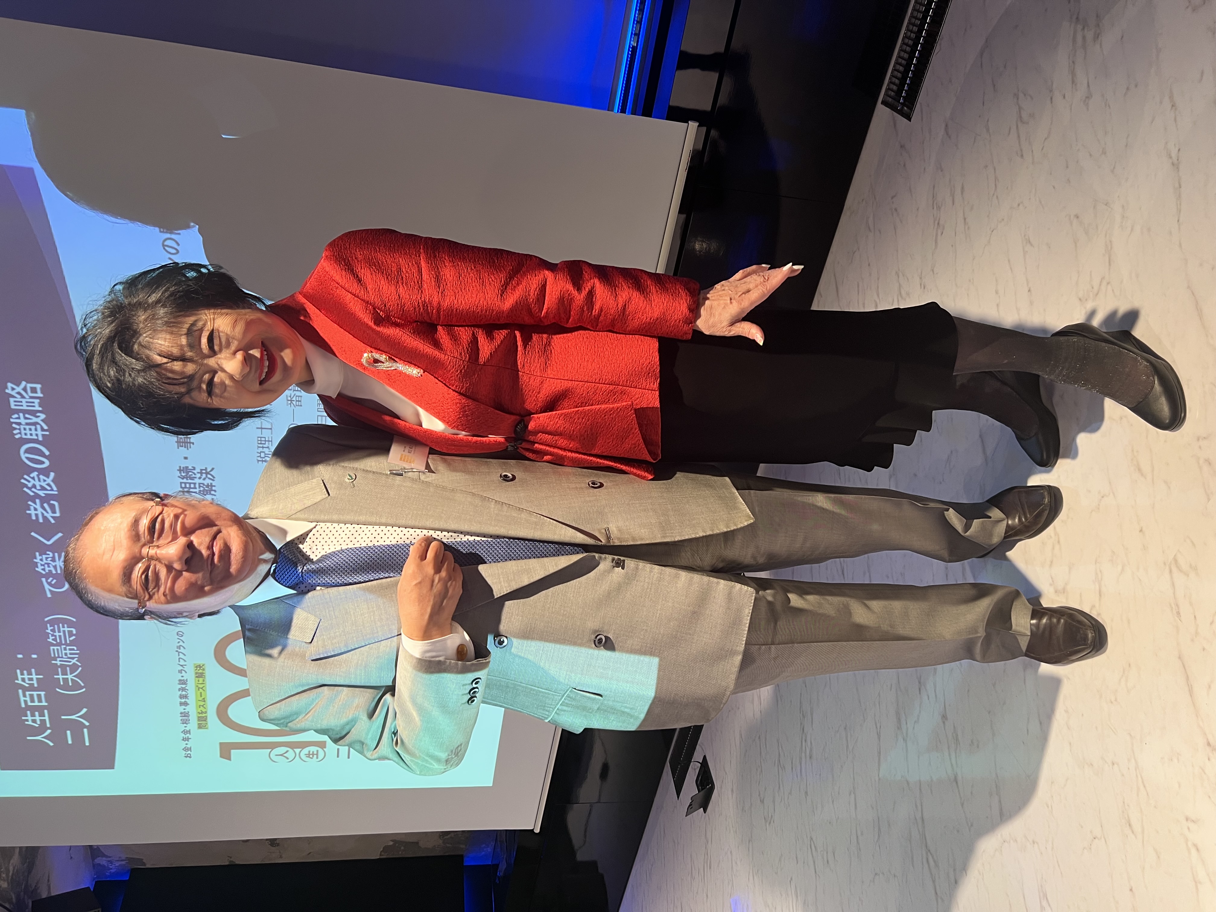 当法人の会長渡辺俊之が出版した「人生百年二人で築く老後の戦略」(推薦文:尾身茂氏・元新型コロナ対策分科会会長)の出版記念パーティが、10月20日(月)と10月28日(火)の二階にわたって東京・有楽町駅前の電気ビル15階にて開催されました。写真は、元参議院議長山東明子氏